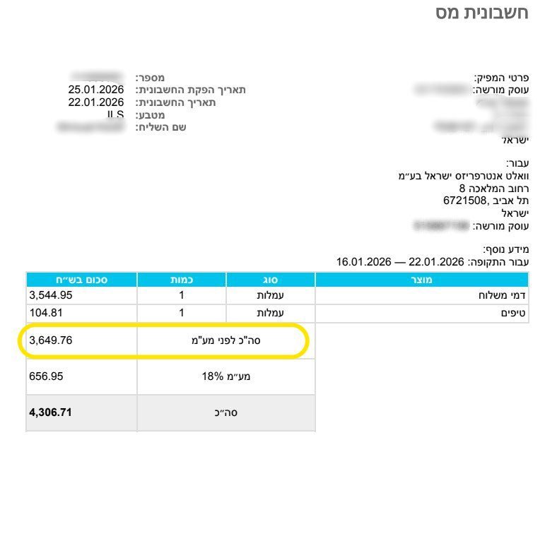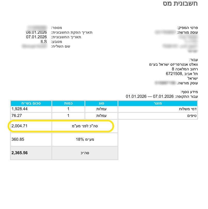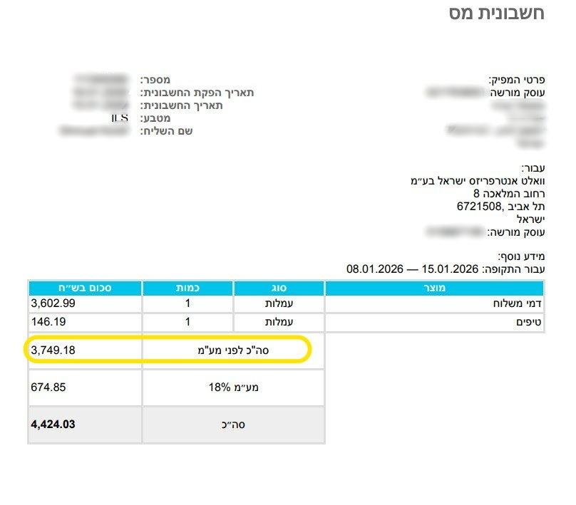 וולט משלמים 4 פעמים בחודש עבור חשבוניות: